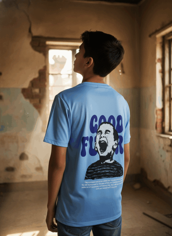 A clean and stylish sky-blue tee featuring a small, bold “Good Future” graphic with a cool character illustration—perfect for everyday casual wear with a modern touch.