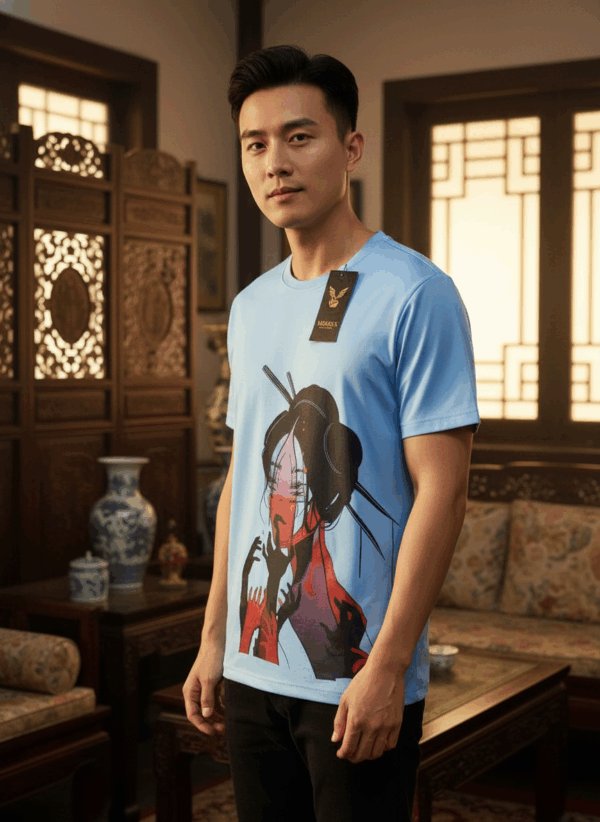 A striking sky-blue T-shirt featuring a bold, artistic illustration of a geisha surrounded by dramatic shadow figures. Perfect for fans of edgy, modern Asian-inspired artwork and statement fashion.