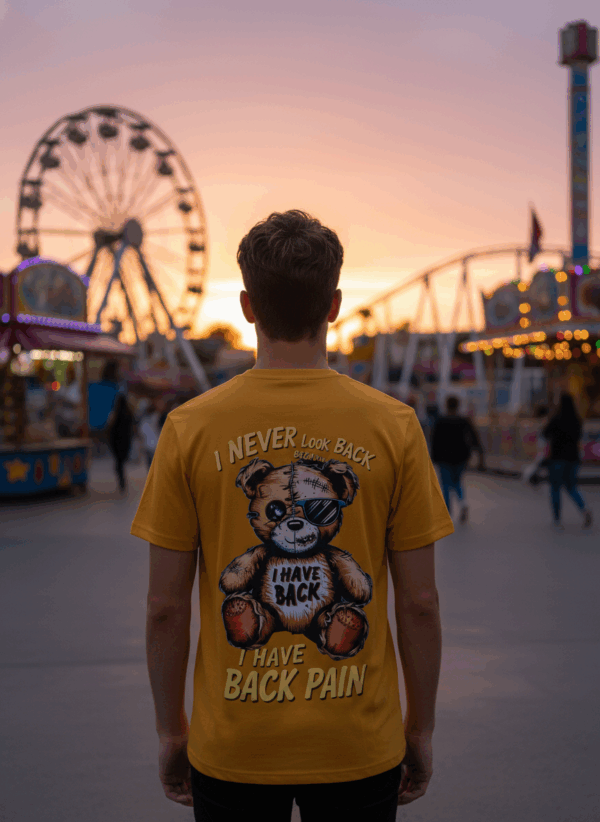 Bring humor to your wardrobe with this bold Back-Pain Bear Tee. Featuring a stitched teddy bear graphic and the phrase “I Never Look Back — I Have Back Pain,” this fun, vibrant shirt blends comfort, personality, and playful sarcasm in one standout design.